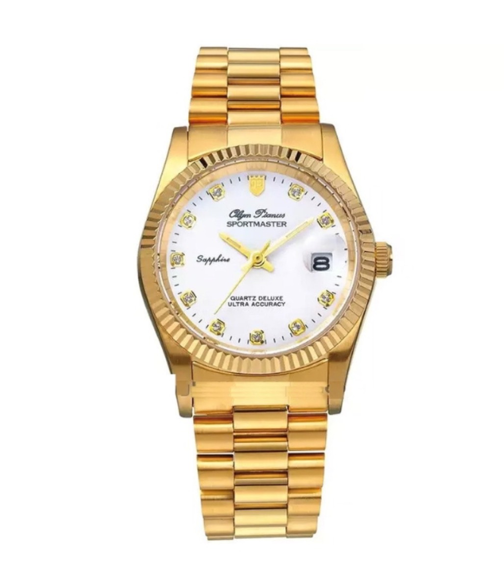 - Mẫu đồng hồ Olym Pianus OP89322GK-T gây ấn tượng ngay từ cái nhìn đầu tiên với thiết kế mặt tròn cổ điển trên nền trắng tinh khiết. Nền trắng của OP89322GK-T không chỉ mang lại vẻ ngoài thanh lịch mà còn làm nổi bật các chi tiết như cọc số đính đá và kim mạ vàng, tạo hiệu ứng ánh sáng bắt mắt. Điểm nhấn của mẫu đồng hồ là gam màu vàng kim sang trọng phủ bóng từ vỏ đến dây đeo. Viền bezel khía rãnh đa giác không chỉ tạo nên vẻ nam tính mạnh mẽ mà còn gợi nhớ đến phong cách của những mẫu đồng hồ cao cấp đình đám của Rolex, mang đến cảm giác đẳng cấp khó cưỡng. Mặt số được bài trí tinh tế với bộ ba kim chỉ mạ vàng đồng bộ, kết hợp 10 cọc số được đính đá lấp lánh, vừa tăng tính thẩm mỹ, vừa hỗ trợ đọc giờ chính xác trong điều kiện thiếu sáng. Dấu ấn thương hiệu Olym Pianus được khắc chìm tinh xảo dưới góc 12 giờ, trong khi góc 9 giờ nổi bật với dòng chữ “Sapphire” in dập nghiêng đầy nghệ thuật, khẳng định chất liệu mặt kính cao cấp. Đặc biệt, góc 6 giờ xuất hiện dòng chữ “Quartz Deluxe Ultra Accuracy” như lời cam kết về độ chính xác tuyệt đối của bộ máy, còn góc 3 giờ là ô lịch ngày tích hợp kính lúp cong độc đáo, giúp quan sát thông tin dễ dàng dù chỉ trong tích tắc. Thiết kế còn tôn lên nét cổ điển qua 4 vấu Explorer Lugs ngắn vừa vặn, ôm trọn dây đeo và tạo độ cân đối hoàn hảo cho tổng thể. Núm vặn điều chỉnh bên phải với khía rãnh sắc nét không chỉ đảm bảo độ kín nước mà còn thêm phần tiện dụng khi thao tác. Điểm nhấn cuối cùng đến từ dây đeo President 3 mắt xích liên kết chặt chẽ, mỗi mắt xích đều được mài bóng tỉ mỉ, ôm trọn cổ tay và mang lại cảm giác thoải mái suốt ngày dài. Tất cả hòa quyện trong một thiết kế vừa phá cách vừa truyền thống, biến OP89322GK-T thành món phụ kiện đắt giá dành cho quý ông yêu sự tinh tế đến từng chi tiết.