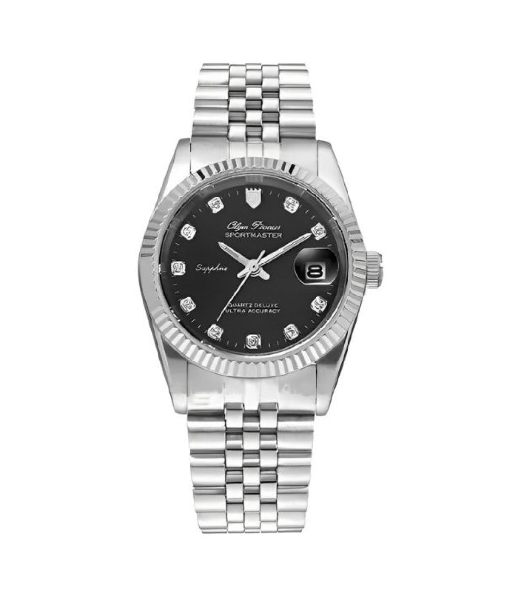 • OP89322GS-D sở hữu thiết kế nổi bật, là sự kết hợp hoàn hảo giữa nét cổ điển và phong cách hiện đại đầy quyến rũ. Mặt số tròn với nền đen huyền bí không chỉ toát lên vẻ sang trọng mà còn tạo cảm giác mạnh mẽ và quyền lực cho người đeo. 11 vị trí giờ được đính kim cương nhân tạo lấp lánh, sắp xếp tinh tế như những vì sao trên bầu trời đêm, tạo nên điểm nhấn thu hút ánh nhìn từ mọi góc độ. Ở trung tâm, logo OP với biểu tượng vương miện nổi bật, đại diện cho sự tự hào và đẳng cấp của thương hiệu. Ngay bên dưới là tên dòng sản phẩm “Sportmaster”, khẳng định phong cách thể thao mạnh mẽ mà mẫu đồng hồ này hướng tới. Bộ ba kim chỉ giờ, phút và giây được thiết kế sắc nét và phủ lớp dạ quang cao cấp, giúp người dùng dễ dàng xem giờ ngay cả trong điều kiện thiếu sáng. Viền bezel được chạm khắc tỉ mỉ với các khía cạnh độc đáo, mang lại cảm giác mạnh mẽ và khác biệt so với các mẫu đồng hồ truyền thống. Tại vị trí 3 giờ là ô lịch ngày nhỏ gọn nhưng vô cùng tiện dụng, hỗ trợ người đeo kiểm soát lịch trình hàng ngày một cách dễ dàng. Đặc biệt, tại cạnh bên góc 9 giờ, thương hiệu đã khéo léo bố trí dòng chữ “Sapphire” để khẳng định chất liệu mặt kính cao cấp, chống trầy xước vượt trội của sản phẩm. Hướng 6 giờ xuất hiện dòng chữ “Quartz Deluxe Ultra Accuracy”, biểu thị cho sự chính xác gần như hoàn hảo của bộ máy, minh chứng cho chất lượng và đẳng cấp vượt trội mà OP89322GS-D mang lại.