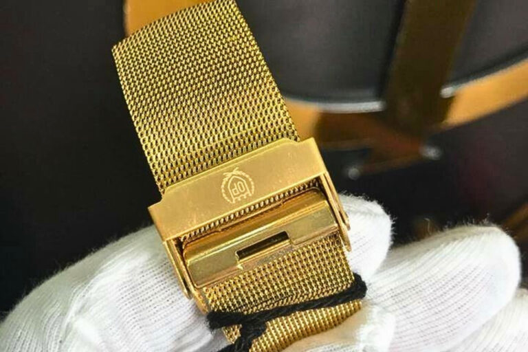 Dây đeo thép đồng bộ: Dây lưới kim loại ôm cổ tay nhẹ nhàng, không gây cấn hay nặng tay. Bề mặt được xử lý kỹ giúp lớp vàng kim giữ màu lâu, mang lại vẻ sang trọng mỗi khi đeo.