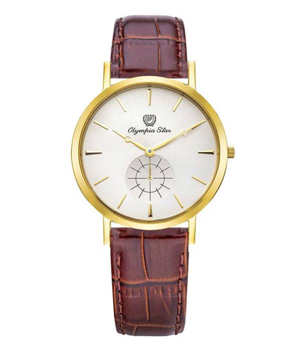 Điểm nhấn tinh tế của chiếc đồng hồ nam Olympia Star nằm ở mặt nền màu trắng với thiết kế 3 kim mạ vàng dạng mắt cáo không đồng trục. Bên cạnh đó, ô đồng hộ phụ nhỏ hiển thị hoạt động của kim giây cũng góp phần làm cho chiếc đồng hồ trở nên ấn tượng, phong cách hơn.